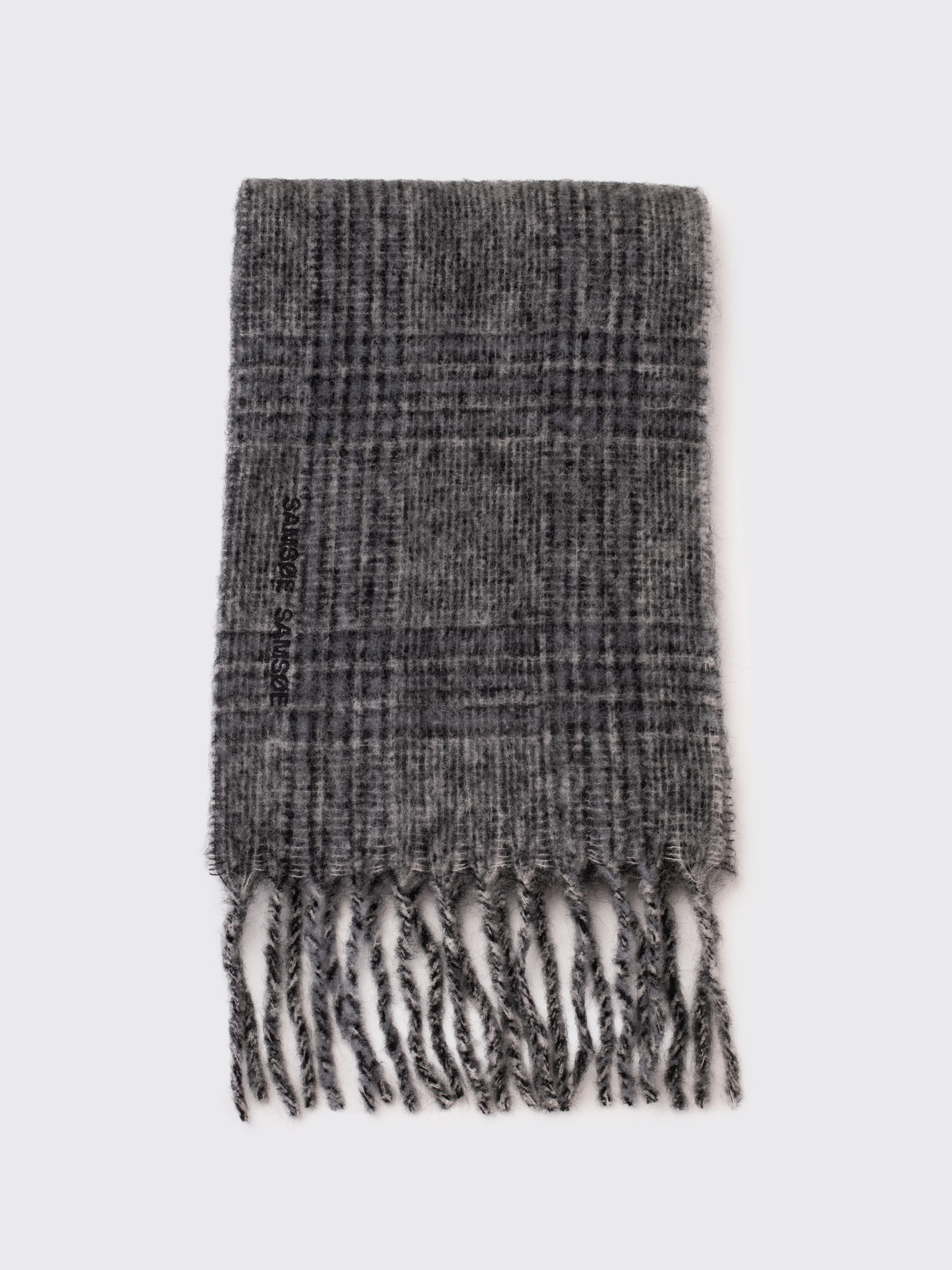 Color: Grey. Long checked scarf with fringes edges. Embroidered SamsOe SamsOe logo branding. Main material made in Italy from a blend with mohair, alpaca wool, and wool.