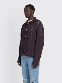 Color: Heavy Roast. Myles Overshirt is constructed from a luxurious cotton/nylon yarn. It features a delicate knitted pattern throughout and feature a regular spread collar, large mother of pearl buttons and a short and boxy knit. Model is 6’3 and wears size L.
