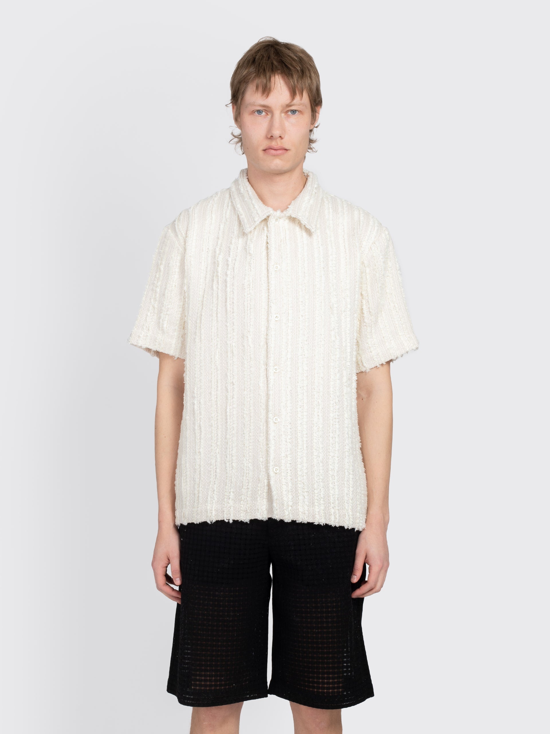 Color: Snowdrop Stripe. The Noam Shirt is constructed from a textured, fringed Italian cotton blend fabric. It features a wide spread collar, mother of pearl buttons, French placket and a regular fit. The model is 6'3 and wears size L.