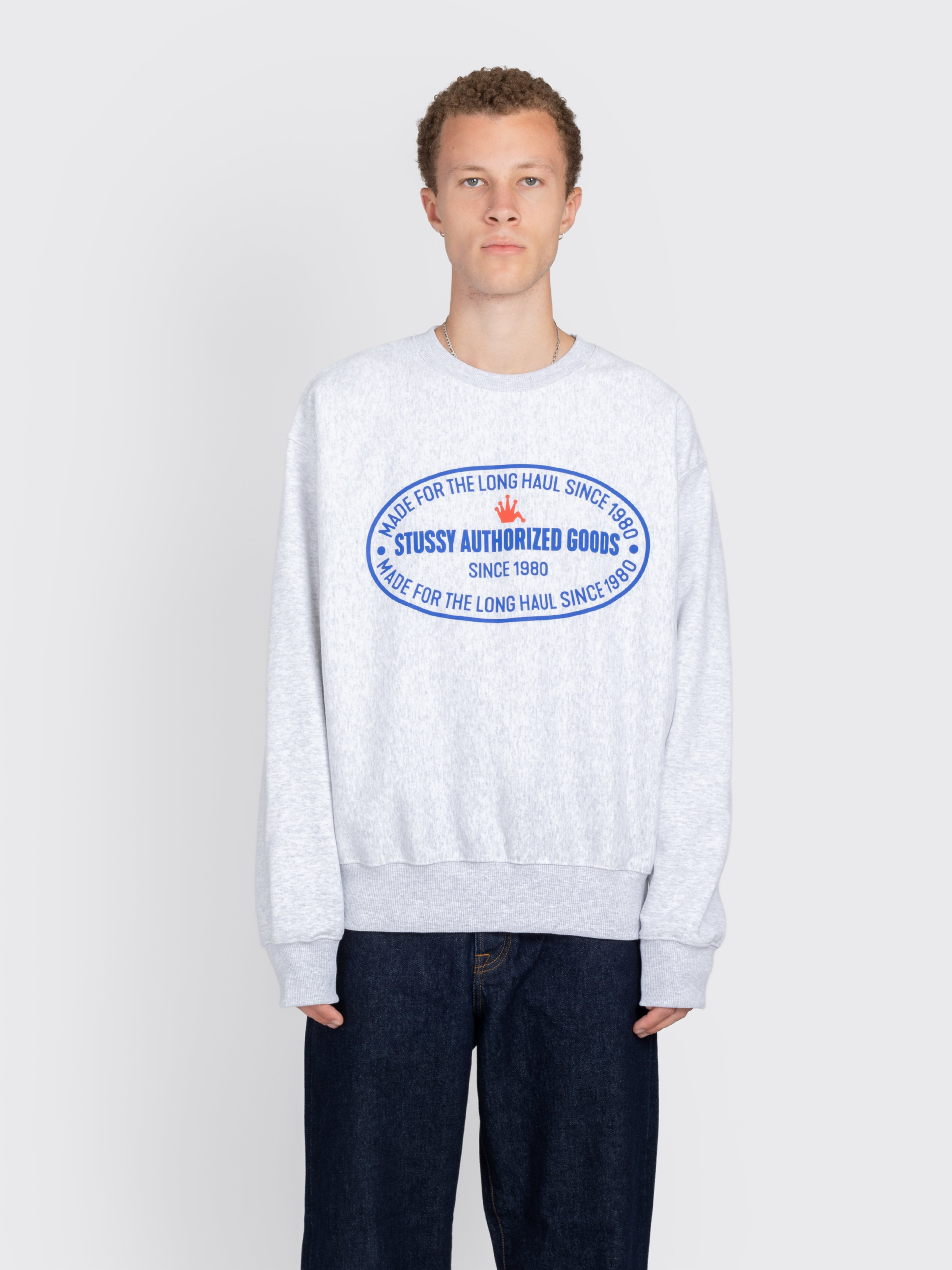 Color: Ash Heather. Relaxed fit crewneck fleece sweatshirt Heavyweight 430gsm cotton blend Ribbed neckline, cuffs and hem Screenprinted graphics Unisex Material: 75% cotton / 25% polyester Model is 6'2 and wears size L.