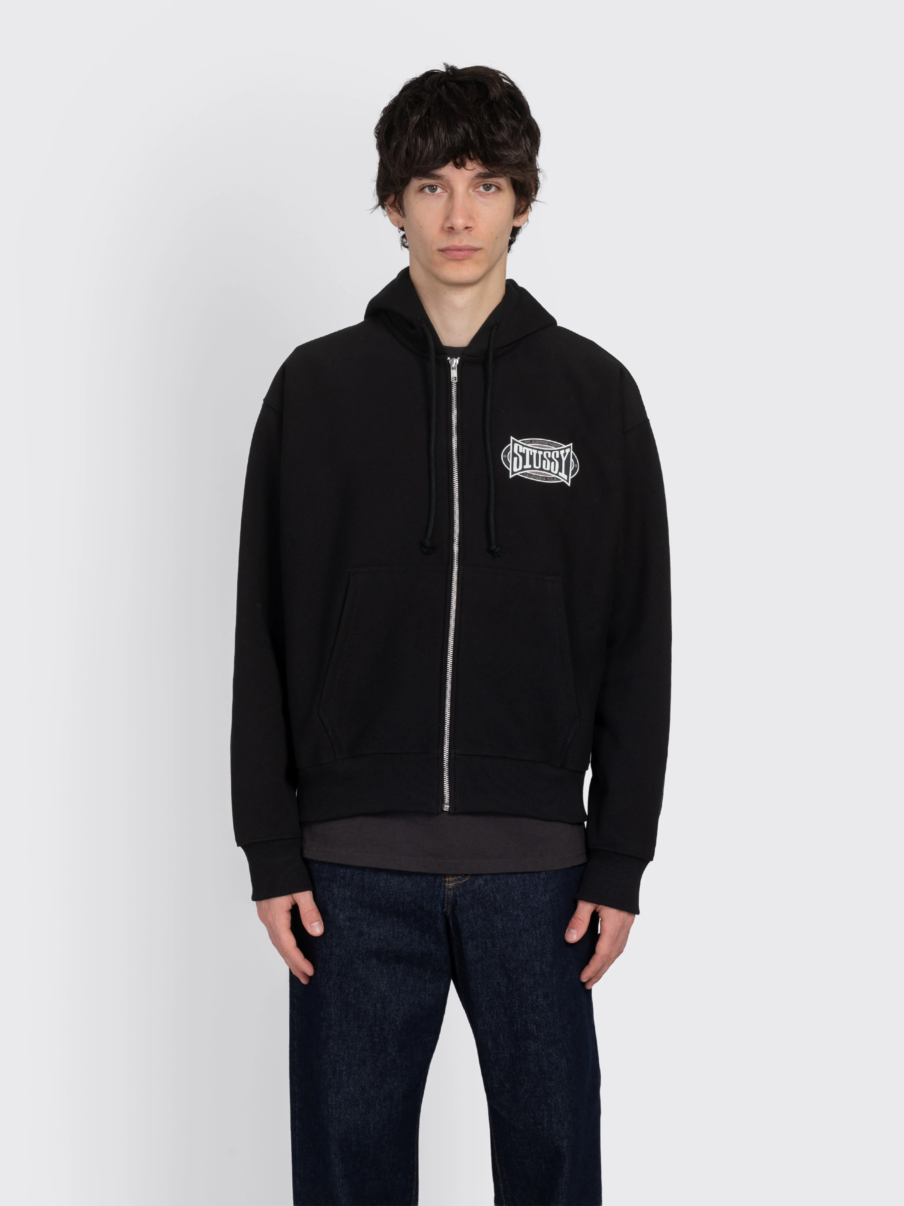 Color: Black. Relaxed fit zip-front hoodie. Heavyweight 430gsm cotton blend fleece. Round drawcord in hood. YKK zip front closure. Screenprinted graphics at front and back. Ribbed cuffs and hem. Patch pockets. Unisex. Model is 6'2 and wears size M.