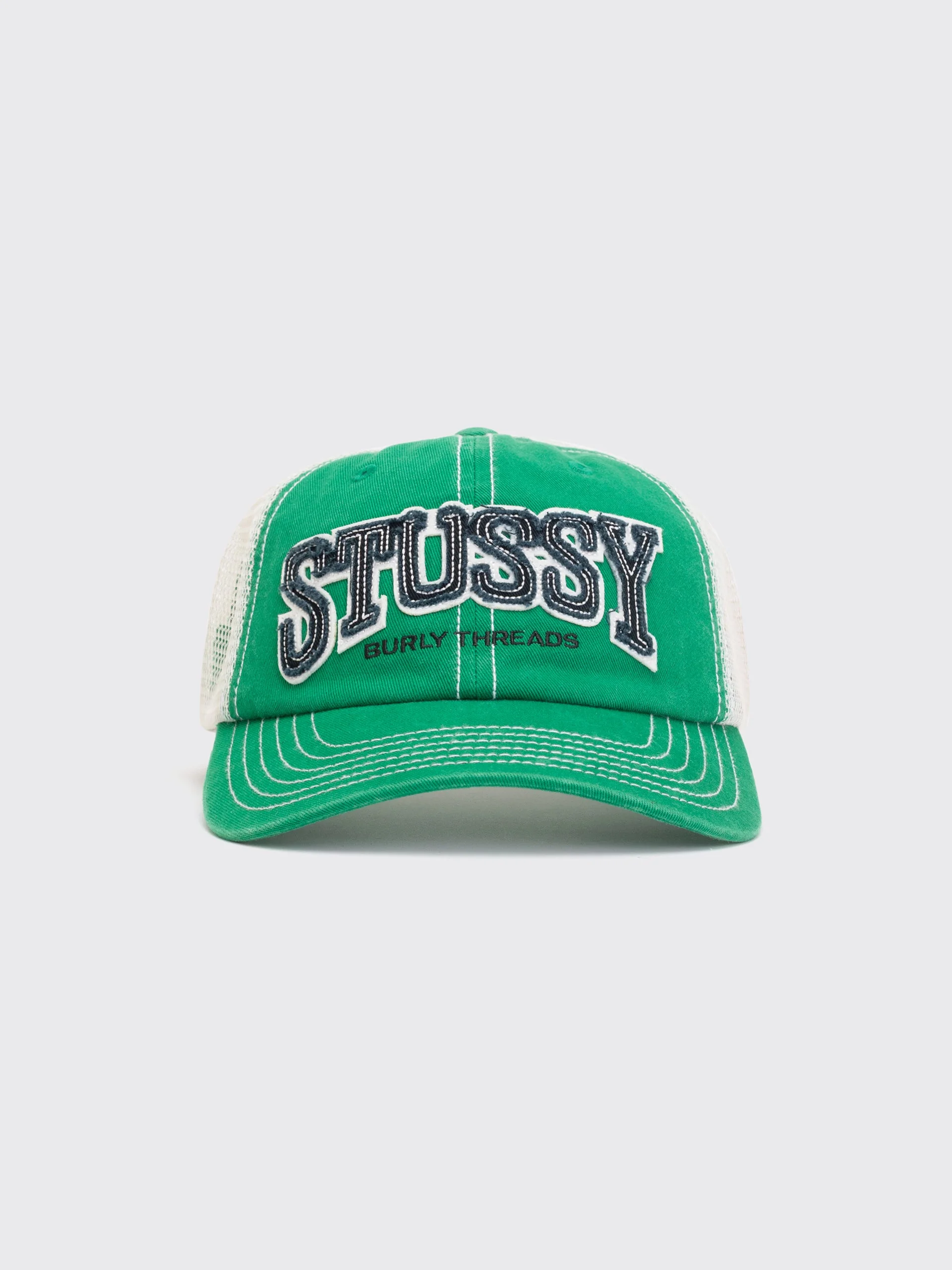 Color: Green. High profile five panel trucker cap Washed cotton canvas with mesh panels Unstructured crown Precurved brim Snapback closure Stussy stock flag label at back Cotton twill sweatband One size Unisex Material: 100% cotton Mesh: 100% polyester