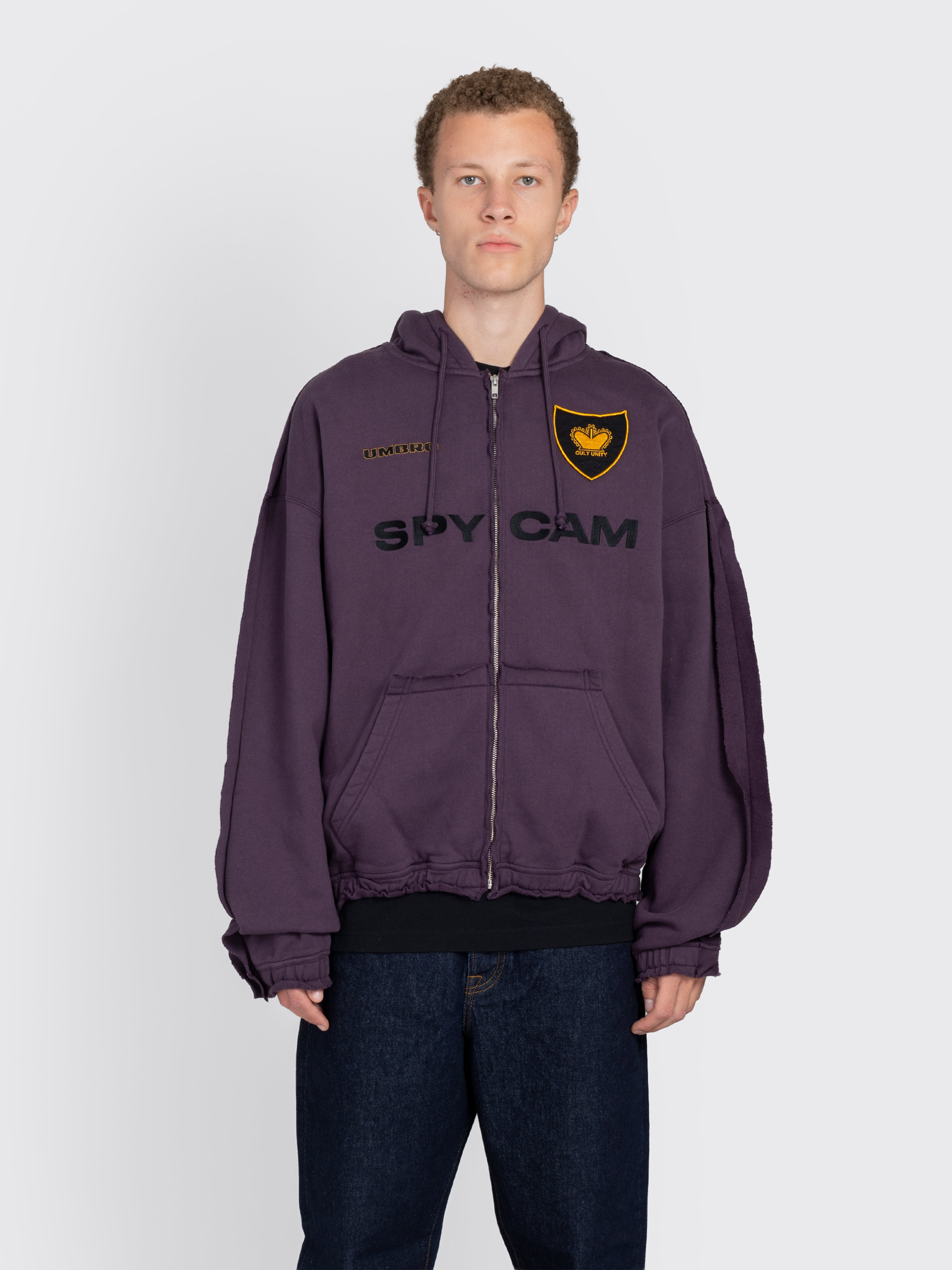 Color: Dark Purple. · Drawstring hood with mask · Zip closure · Embroidered logo patch at chest, "spycam" across · Welt pockets at waist · Elasticized hem and cuffs with exposed seams · Dropped shoulders Model is 6'2 and wears size M.