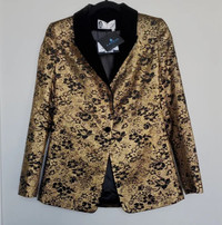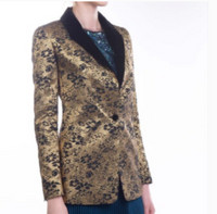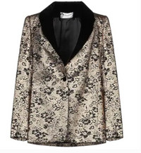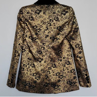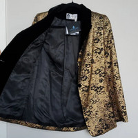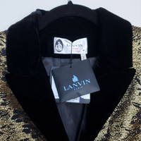 Incredible! This blazer jacket is absolutely amazing and something you NEED to see in person! Lanvin is an exceptional Parisian Designer that makes rare handmade pieces loved by celebrities alike. This jacket is rare and one of a kind and the detailing is quite impressive! Featuring Velvet Lapel Velvet Buttons (one in front and 4 on each sleeve) Expertly tailored but still a bit oversized Black Flowers on front contrasting the gold shimmer Shoulder Pads but not too big to help with structure Single breasted Lined Colour is a Yellow Gold with Black Velvet and Black Inner Lining This a treasure! Size FR 36 or a US S Armpit to Armpit: 17" Length: 27 1/2" Sleeves: 24" Original Retail over $4000!!!