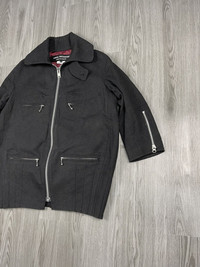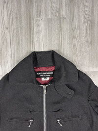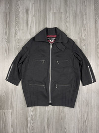 2011 a/w collection Junya Watanabe Commes des Garçons jacket comes with black wool blend featuring three-quarter-length sleeves, a front zipper closure, four front welt pockets, zipper accents on sleeve cuffs all in a silver-toned hardware, and a pleated bottom hem detail. For women! Originally made in japan Condition: Very Good (no hole or stain) Materials: Body: 46% Wool 38% Cotton 8%Acrylic 8% Polyester | Lining: 100% Cupra Shipping worldwide Ref:JT-54