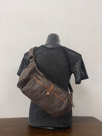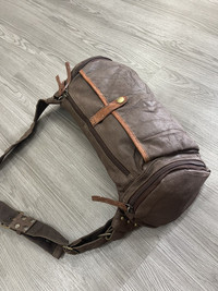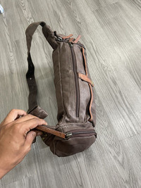 Medium size Measurement on photo in inches Waxed canvas and leather puller Adjustable strap length Good condition