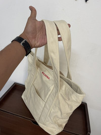 Size about medium Manual on photo in inches Hard cotton Heavy duty totes Havi light dirt due storage All sale are final Shipping worldwide