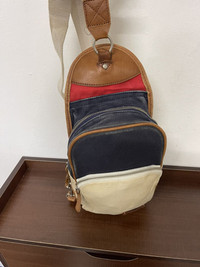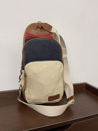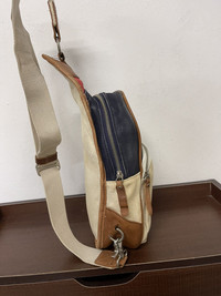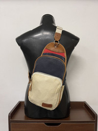 Unisex Nice bag Tricolour Dock denims and leather material Heavy duty Size on photo in inches Can be crossbody on right and left Good condition Have a dirt on cream part (photo) Vintage good Shipping worldwide All sale are final