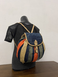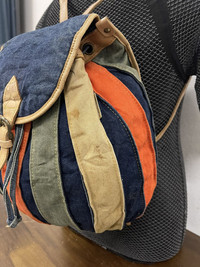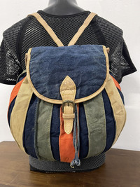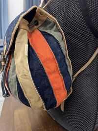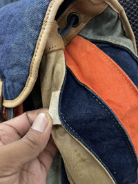 Size about medium Refer measuremet on photo (in inches) All denim body with leather trim Having sign of use on leather and some dirt on denim 4 hole step buckle adjuster Shipping worldwide All sale are final