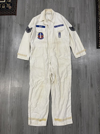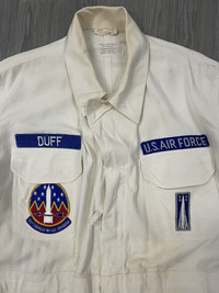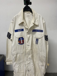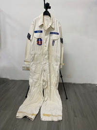 60's USAF CMU-3/P HBT jumpsuit. The contractor is MASON & HUGHES INC, and the mil spec is MIL-C-27845A.The contract number from the 1963 fiscal year is listed. This item is said to have been worn by mechanics working in USAF missile hangars. Generally, a fabric like cotton sateen is used.The front features a black CONMAR zipper. The top is a sewn plastic button instead of a snap. The flap, sleeves, and hem are secured with Velcro. There are slight stains near the left thigh and near the center of the back. There is no damage and I think the condition is quite good. The size is X-large Regular.It's hard to come across cotton satin CMU-3/P, but herringbone twill fabric is almost impossible to find, so I think it's a perfect item for your collection. If you like military jumpsuits, please give this a try. Having yellowish on pair I do shipping worldwide All sale are final