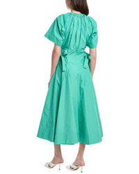 - About the Product: - Jade Green Poplin Midi Dress with Bell Sleeves - Color/Pattern: Jade - Bell-sleeves and ruffle trim - Slip-on - Gathered neckline - Side tie waist detail - A-Line silhouette - 70% cotton, 30% polyester - Machine wash - Imported - Size & Fit: - Approximately 49 inches from shoulder to hem - Model is 5'10.5 and is wearing a size 4 - Measurements may vary slightly by size