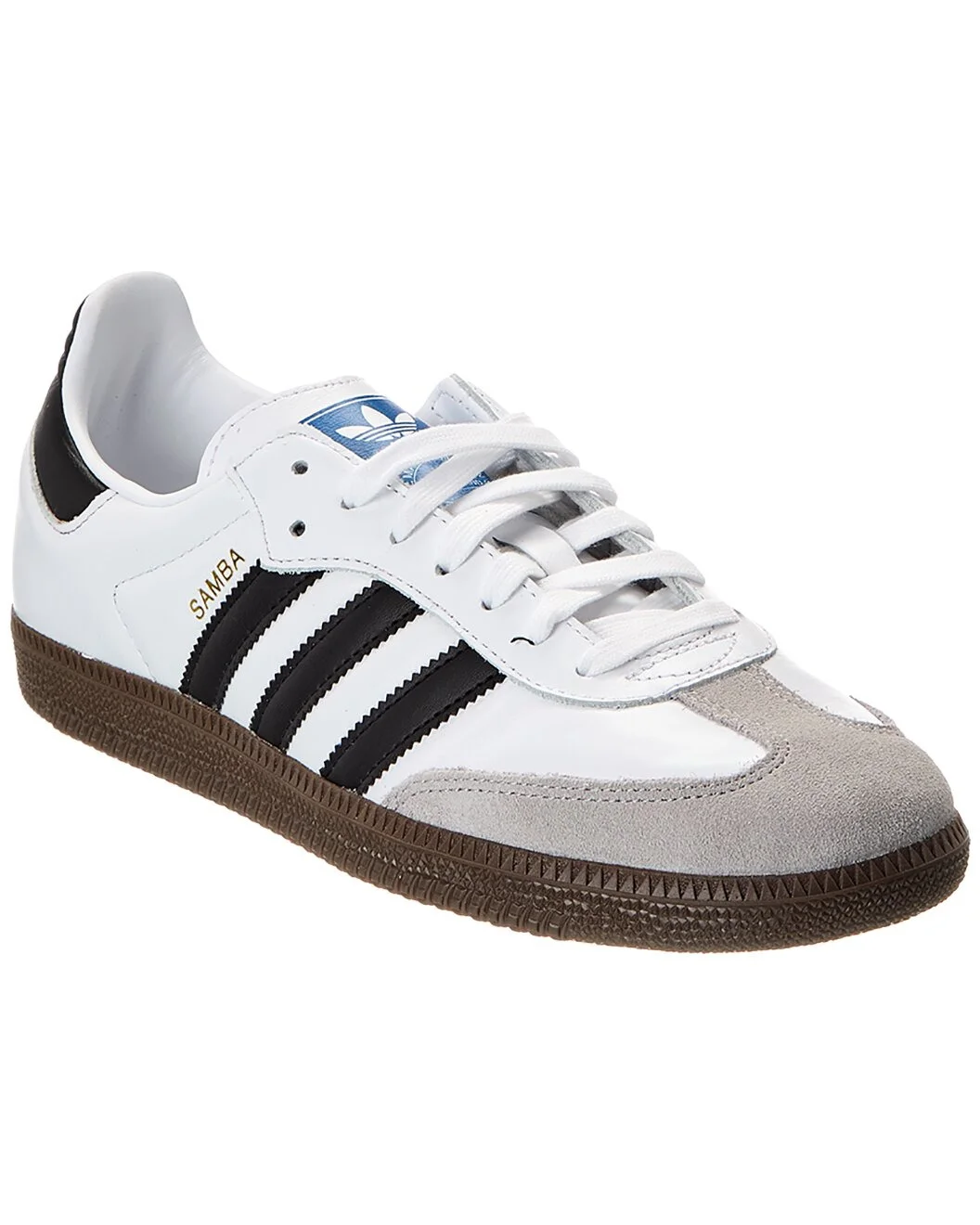 - About the brand: Innovative athletic wear for every sport. - Samba Blanche Leather & Suede Sneaker in white/black leather and suede with gum sole and logo accents - Lace-up closure - Lightly padded insole - Rubber sole with traction