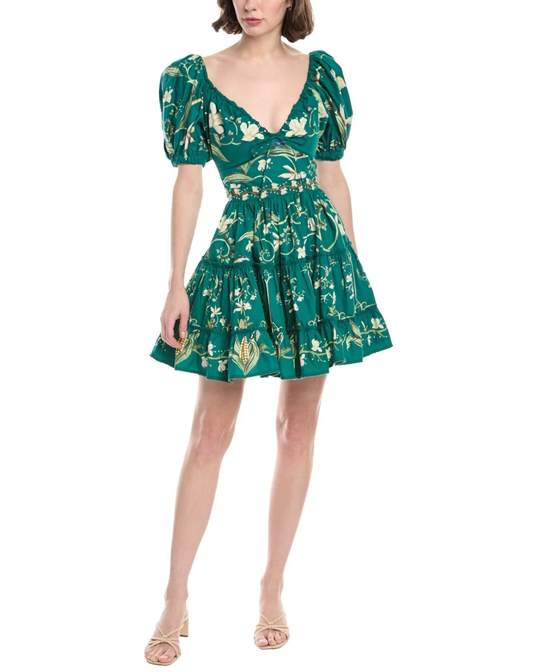 - Color/pattern: manzanilla - Approximately 34in from shoulder to hem - Model is 5'9 and is wearing a size small. Measurements may vary slightly by size. - Design details: scoop neck with self-tie detail, elastic puff sleeves, embroidered detailing, bead embellishments and ruffle trim - Center back zipper with hook-and-eye closure - 100% cotton - Machine wash - Imported