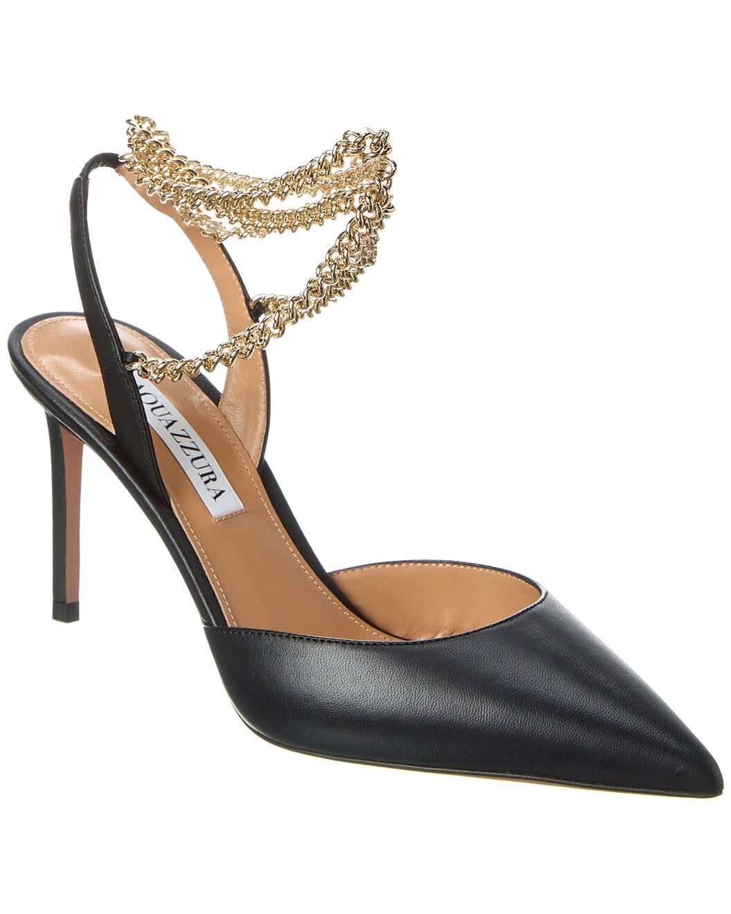 - Price as marked - About the brand: Sophisticated, sexy, & fun. - Please note: Size selections are European. For US conversions, please reference size chart. - Made in Italy - Flash 85 Leather Slingback Pump in black leather and gold-tone hardware with chain detailing - Lightly padded leather insole - Smooth leather sole - 3.5in heel - Please note: All measurements are approximate and were taken from a size 37; slight variations may occur. - Our products are 100% genuine. In some cases we purchase merchandise from trusted independent suppliers and not directly from the brand owner. In all cases we stand by the authenticity of every product sold on our site.