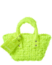 - About the brand: Recognized as one of the most influential names in fashion, Balenciaga has a reputation of uncompromising standards. Unmistakable, ultra-modern shapes and high-concept collections set Balenciaga apart, from runway to ready-to-wear. High-end collaborations and a renewed focus on fine-crafted handbags and footwear earn the brand a coveted spot as a viral, celebrity favorite. - Made in Italy - Bistro XXS Tweed Basket Tote in fluo yellow sparkling tweed and palladium metal hardware with luggage tag charm - Interior design details: tweed interior, zippered pocket - Measures 11in wide x 5.5in high x 2.5in deep - Top handles drop 4in - Removable shoulder strap drops 20in - Open top - Please note: All measurements were taken by hand and are approximate; slight variations may occur. - Our products are 100% genuine. In some cases we purchase merchandise from trusted independent suppliers and not directly from the brand owner. In all cases we stand by the authenticity of every product sold on our site.