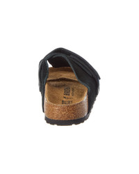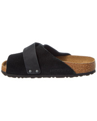 - About the brand: Iconic and sustainable designs that are always on-trend. - Please note: Size selections are European. For US conversions, please reference size chart. - Kyoto Suede Sandal in black suede and silver-tone hardware - Velcro® closure - Original Birkenstock® suede-lined natural cork footbed that molds and shapes to your foot, featuring pronounced arch support, deep heel cup, and roomy toe box. - Man-made sole - Made in Germany