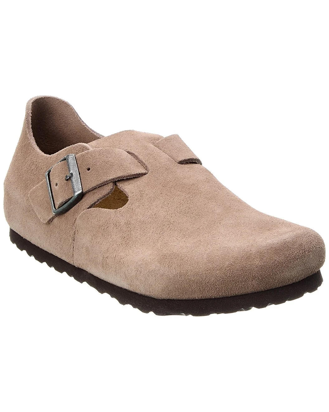 - About the brand: Iconic and sustainable designs that are always on-trend. - Please note: Size selections are European. For US conversions, please reference size chart. - London BS Suede Clog in taupe suede and silver-tone hardware - Buckle closure - Original Birkenstock suede-lined natural cork footbed that molds and shapes to your foot, featuring pronounced arch support, deep heel cup, and roomy toe box. - Man-made sole - Made in Germany