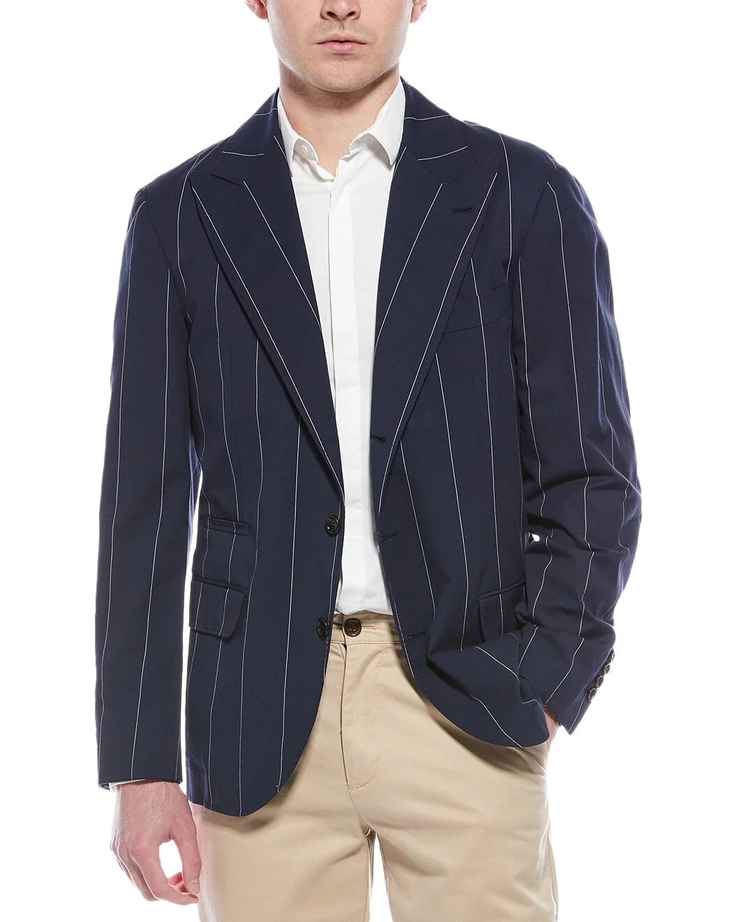 - About the brand: Hailed for its beautifully-crafted cashmere pieces, Brunello Cucinelli was named GQ's Designer of the Year in 2021. With attention to craftsmanship and sustainability, the company exemplifies Italian luxury. - Blazer in navy with notch lapel, left chest pocket, three front pockets, and side vents at hem - Please note: Size selections are European. For US conversions, please reference the size chart. - Approximately 29in from shoulder to hem - Model is 6'2 and is wearing a size 50. Measurements may vary slightly by size. - Three-button closure - Shell: 98% cotton, 2% elastane - Lining: 100% cupro - Dry clean only - Made in Italy - Our products are 100% genuine. In some cases we purchase merchandise from trusted independent suppliers and not directly from the brand owner. In all cases we stand by the authenticity of every product sold on our site.