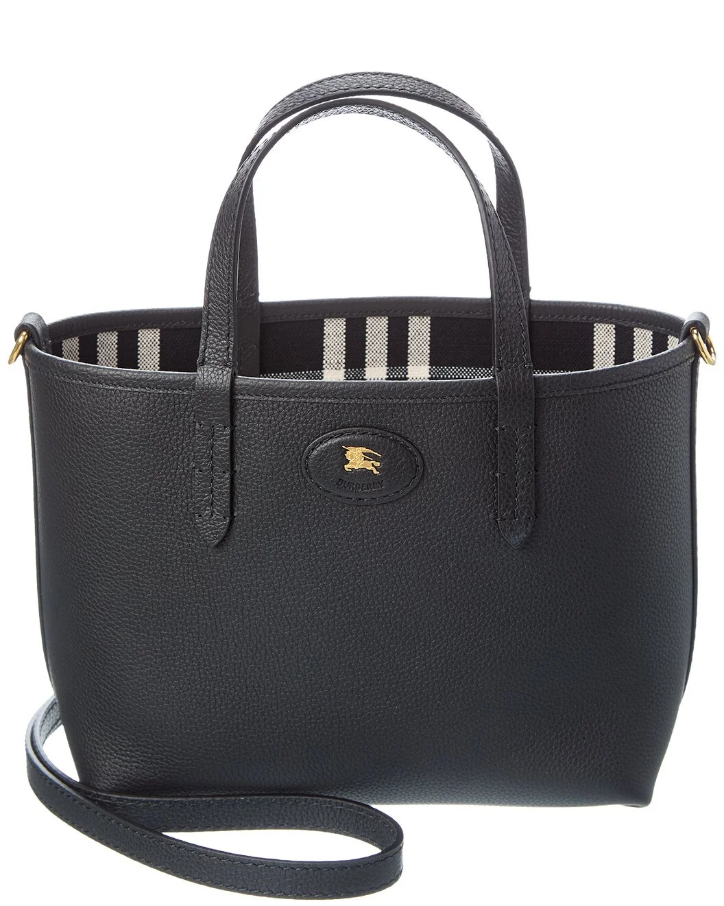 - About the brand: Iconic patterns, materials and silhouettes have made Burberry a coveted luxury staple since 1856. From waterproof, patented gabardine fabric to the unmistakable vintage check and the more modern monogram pattern, Burberry boasts undeniably British influence with timeless appeal. - Made in Italy - Bloomsbury Reversible Check Canvas & Leather Tote in black/calico beige check canvas; reverses to black leather and gold-tone hardware with logo accent - Measures 11.5in wide x 7.5in high x 4.5in deep - Top handles drop 4in - Adjustable and removable shoulder strap drops 25in - Open top - Please note: All measurements were taken by hand and are approximate; slight variations may occur. - Our products are 100% genuine. In some cases we purchase merchandise from trusted independent suppliers and not directly from the brand owner. In all cases we stand by the authenticity of every product sold on our site.