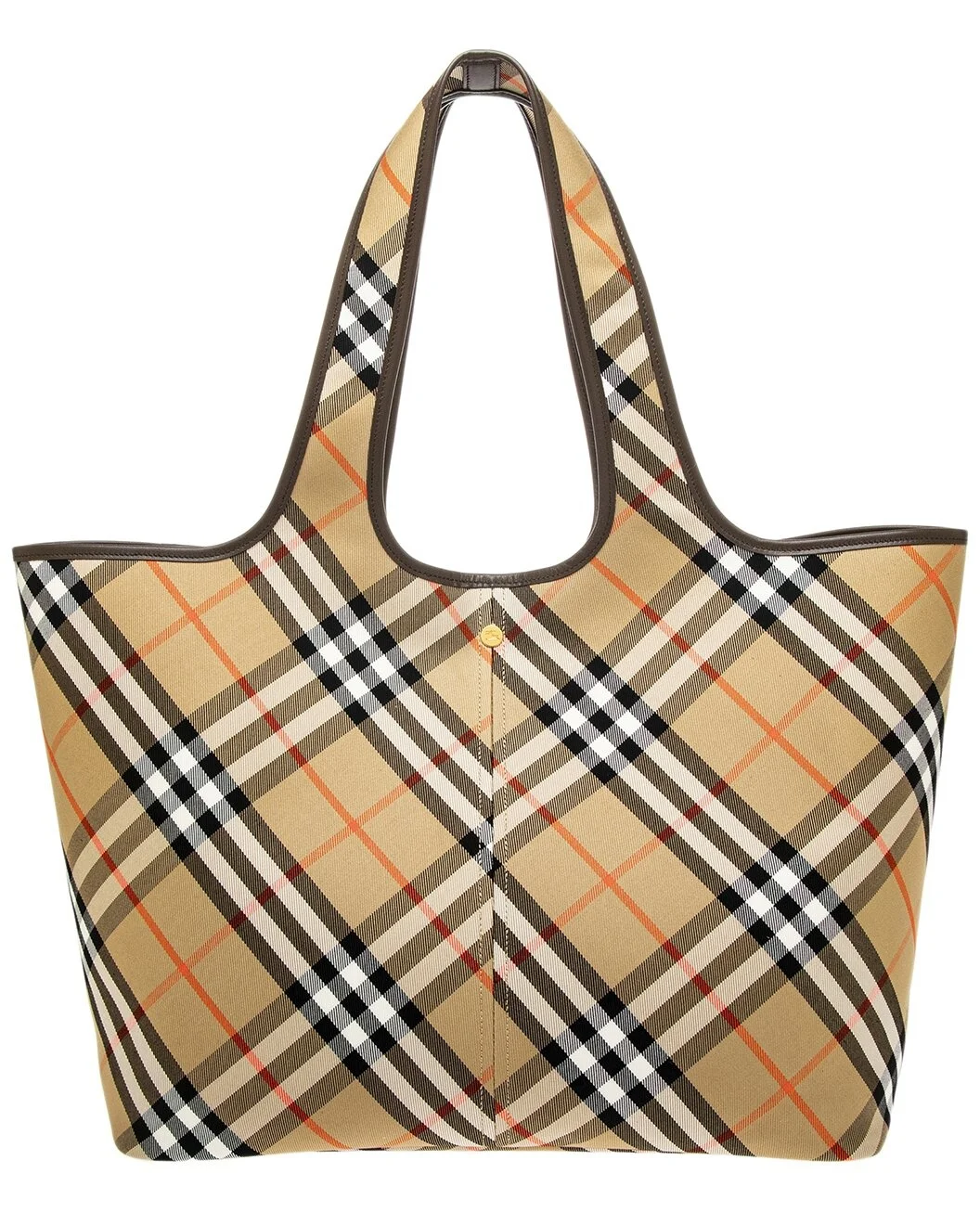 - About the brand: Iconic patterns, materials and silhouettes have made Burberry a coveted luxury staple since 1856. From waterproof, patented gabardine fabric to the unmistakable vintage check and the more modern monogram pattern, Burberry boasts undeniably British influence with timeless appeal. - Made in Italy - Color/material: sand fabric & leather - Design details: gold-tone hardware; Soft cotton jacquard twill in Burberry Check, calf leather trim, hand painted edges - Interior design details: One main compartment, detachable zip pouch - Measures 15.4in wide x 7.5in high x 12.6in deep - Top handles drop 8.3in - Press stud snap closure - Protective feet at bottom - Please note: All measurements were taken by hand and are approximate; slight variations may occur. - Our products are 100% genuine. In some cases we purchase merchandise from trusted independent suppliers and not directly from the brand owner. In all cases we stand by the authenticity of every product sold on our site.