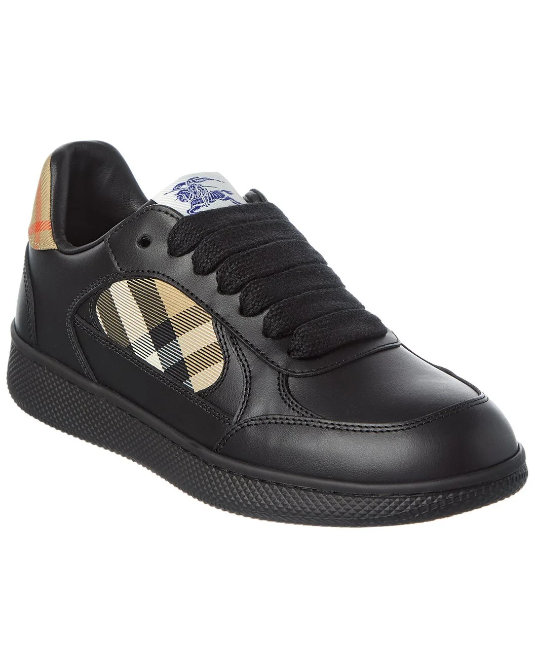 - About the brand: Iconic patterns, materials and silhouettes have made Burberry a coveted luxury staple since 1856. From waterproof, patented gabardine fabric to the unmistakable vintage check and the more modern monogram pattern, Burberry boasts undeniably British influence with timeless appeal. - Please note: Size selections are European. For US conversions, please reference size chart. - Made in Italy - Check Terrace Leather Sneaker in black and sand leather and textile with logo accent - Lace-up closure - Smooth leather insole - Man-made sole - Please note: All measurements are approximate and were taken from a size 37; slight variations may occur. - Our products are 100% genuine. In some cases we purchase merchandise from trusted independent suppliers and not directly from the brand owner. In all cases we stand by the authenticity of every product sold on our site.