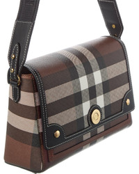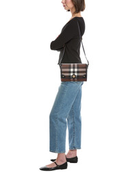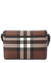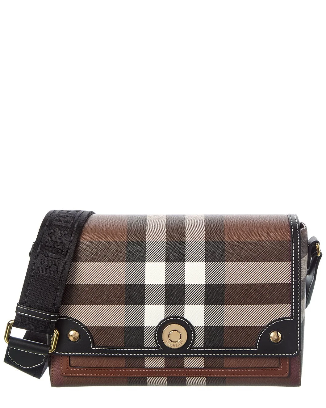 - About the brand: Iconic patterns, materials and silhouettes have made Burberry a coveted luxury staple since 1856. From waterproof, patented gabardine fabric to the unmistakable vintage check and the more modern monogram pattern, Burberry boasts undeniably British influence with timeless appeal. - Made in Italy - Note Medium Check E-Canvas & Leather Shoulder Bag in dark birch brown check E-canvas and black leather with gold-tone hardware - Interior design details: leather and fabric lining, interior pocket - Measures 10in wide x 7in high x 3.5in deep - Adjustable shoulder strap drops 24in - Fold-over flap with magnetic closure - Please note: All measurements were taken by hand and are approximate; slight variations may occur. - Our products are 100% genuine. In some cases we purchase merchandise from trusted independent suppliers and not directly from the brand owner. In all cases we stand by the authenticity of every product sold on our site.