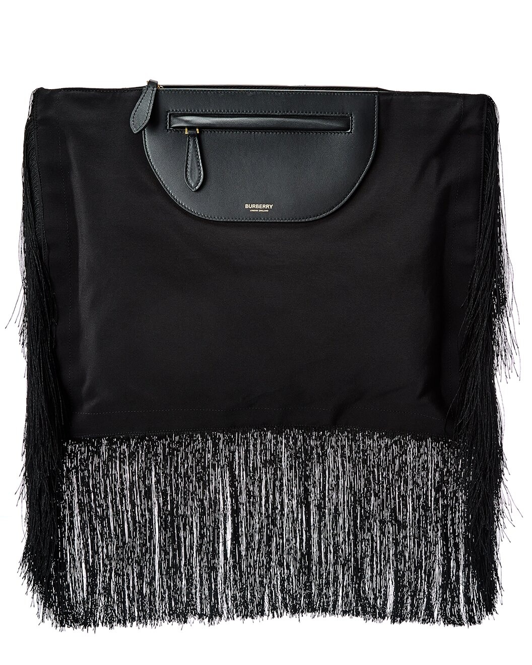 - Price as marked - About the brand: Iconic patterns, materials and silhouettes have made Burberry a coveted luxury staple since 1856. From waterproof, patented gabardine fabric to the unmistakable vintage check and the more modern monogram pattern, Burberry boasts undeniably British influence with timeless appeal. - Made in Italy - Olympia Fringe Canvas & Leather Clutch in black canvas and leather and gold-tone hardware with fringe trim and zippered pocket - Interior design details: leather lining - Measures 13in wide x 16in high x 1.5in deep - Zipper closure - Please note: All measurements were taken by hand and are approximate; slight variations may occur. - Our products are 100% genuine. In some cases we purchase merchandise from trusted independent suppliers and not directly from the brand owner. In all cases we stand by the authenticity of every product sold on our site.