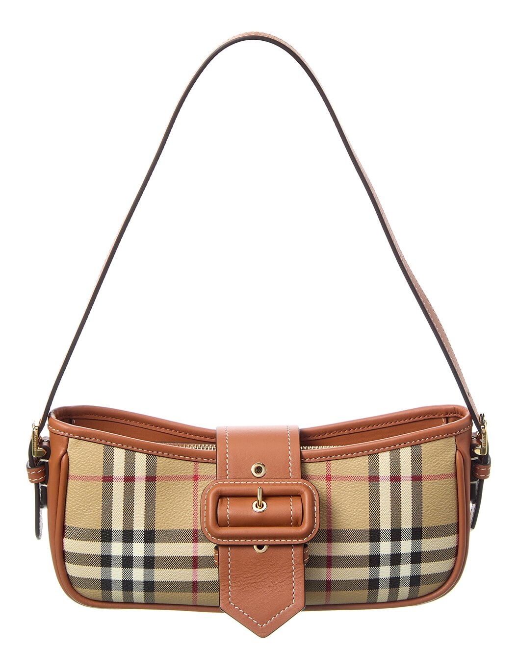 - About the brand: Iconic patterns, materials and silhouettes have made Burberry a coveted luxury staple since 1856. From waterproof, patented gabardine fabric to the unmistakable vintage check and the more modern monogram pattern, Burberry boasts undeniably British influence with timeless appeal. - Made in Italy - Vintage Check E-Canvas & Leather Shoulder Bag in briar brown E-Canvas and leather and gold-tone hardware with buckle accent - Interior design details: zippered interior - Measures 10.5in wide x 5in high x 2.5in deep - Adjustable shoulder strap drops 14in - Fold-over flap with magnetic closure - Please note: All measurements were taken by hand and are approximate; slight variations may occur. - Our products are 100% genuine. In some cases we purchase merchandise from trusted independent suppliers and not directly from the brand owner. In all cases we stand by the authenticity of every product sold on our site.