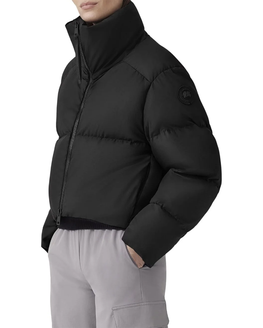 - Guaranteed for Valentine's Day. Delivery restrictions apply. - See disclaimer. - About the brand: Canada Goose. Function-first apparel with a nod to adventure. - Garnet Cropped Puffer Coat in black - Minimal streamlined silhouette. - Recessed rib-knit cuff for added warmth. - Interior hem drawcord for enhanced fit. - Removeable backpack straps. - Down-filled storm guard under two-way zipper. - Two exterior pockets: zippered hand pockets. - Two interior pockets: drop-in pockets. - Zipper closure - 100% Pima Cotton - Dry clean only - Made in Canada - Our products are 100% genuine. In some cases we purchase merchandise from trusted independent suppliers and not directly from the brand owner. In all cases we stand by the authenticity of every product sold on our site.
