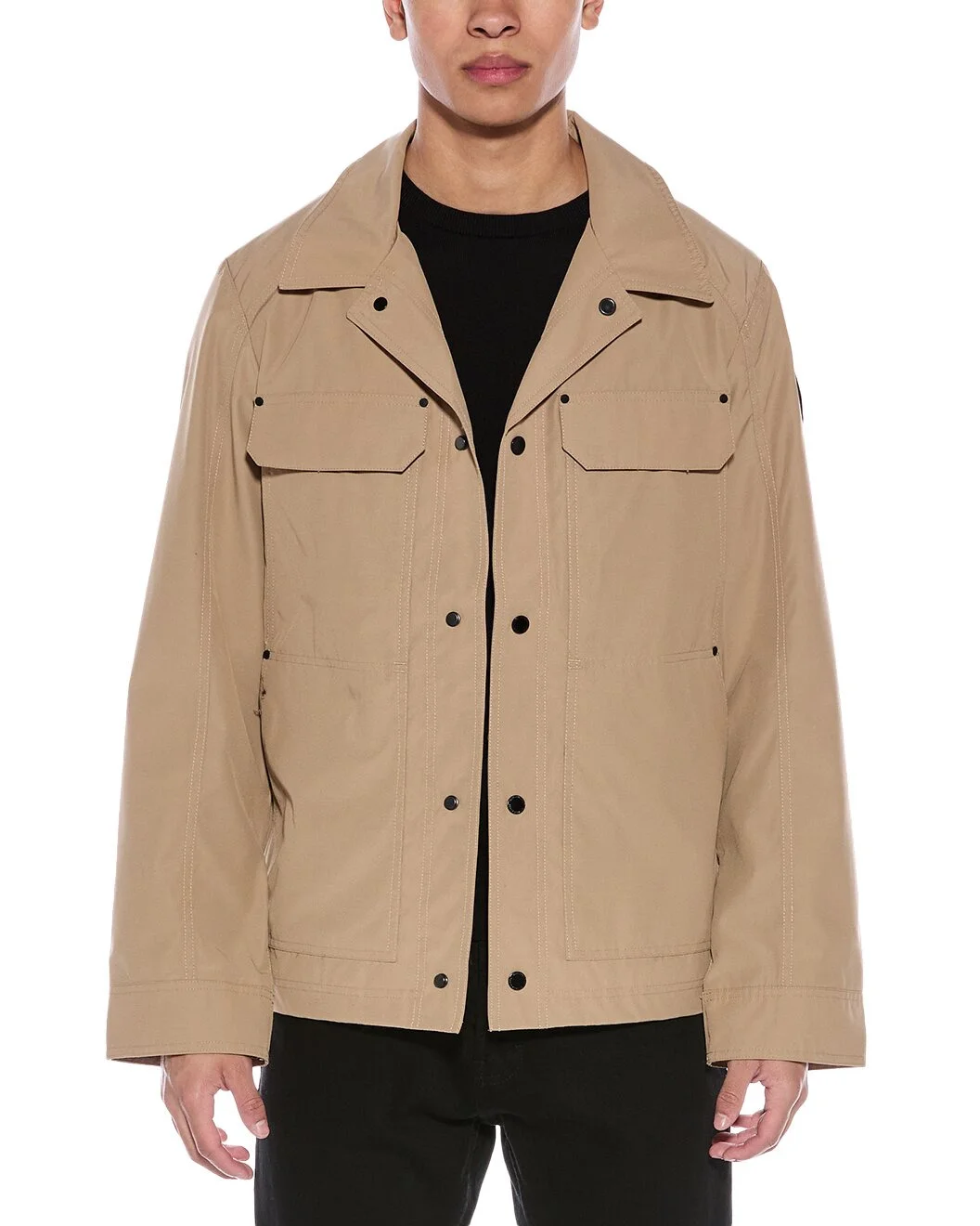 - About the brand: Canada Goose. Function-first apparel with a nod to adventure. - Jacket in beige with spread collar, four front pockets, patch logo and snap cuffs - Approximately 30in from shoulder to hem - Model is 6'2 and is wearing a size medium. Measurements may vary slightly by size. - Snap front - Lightweight - 84% polyester, 16% cotton - Lining: 100% polyester - Machine wash - Made in Canada - Our products are 100% genuine. In some cases we purchase merchandise from trusted independent suppliers and not directly from the brand owner. In all cases we stand by the authenticity of every product sold on our site.