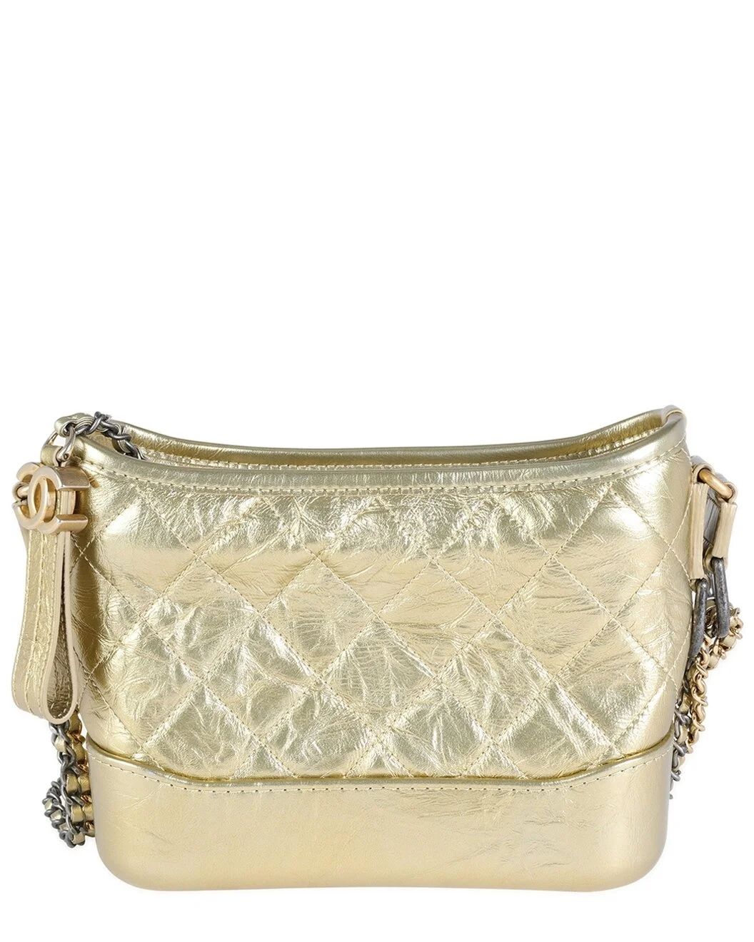 - About the brand: Founded by Coco Chanel in 1910, this French luxury fashion house revolutionized haute couture. Chanel offers exceptional and uncomplicated fashion, accessories, beauty, and luxury goods. - This is an authentic, pre-loved piece. This item is in very good condition and shows light signs of wear. This item is in very good condition with minor signs of wear. faint scuffing around base. tarnishing to hardware. - For more information on condition, please see our condition guide at the bottom - Small Gabrielle Hobo in Gold Quilted Leather with fabric lining and gold-tone and silver-tone hardware - Measurements: 7.9in long x 3.1in wide x 5.8in high; 17in handle; 28in strap - Please note: All measurements were taken by hand and are approximate; slight variations may occur. - Accompanied by authenticity card - Zipper closure - The Pre-Loved Condition Guide - Our products are 100% genuine. In some cases we purchase merchandise from trusted independent suppliers and not directly from the brand owner. In all cases we stand by the authenticity of every product sold on our site.