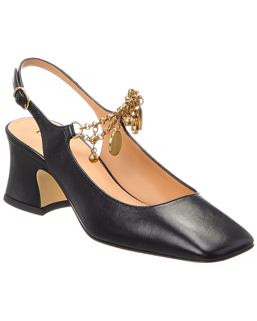 - About the brand: Romantic, cool, and glamorous. - Please note: Size selections are European. For US conversions, please reference size chart. - Made in Italy - Charms Leather Pump in black leather and gold-tone hardware with chain ankle strap and logo charms - Adjustable ankle strap with buckle closure - Lightly padded leather insole - Smooth leather sole - 2in heel - Please note: All measurements are approximate and were taken from a size 37; slight variations may occur. - Our products are 100% genuine. In some cases we purchase merchandise from trusted independent suppliers and not directly from the brand owner. In all cases we stand by the authenticity of every product sold on our site.