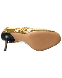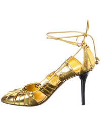 - About the brand: Romantic, cool, and glamorous. - Please note: Size selections are European. For US conversions, please reference size chart. - Made in Italy - Decollete Leather Pump in gold leather and gold-tone hardware with bead accents - Self-tie ankle wrap closure - Lightly padded leather insole - Smooth leather sole - 4in heel - Please note: All measurements are approximate and were taken from a size 40; slight variations may occur. - Our products are 100% genuine. In some cases we purchase merchandise from trusted independent suppliers and not directly from the brand owner. In all cases we stand by the authenticity of every product sold on our site.