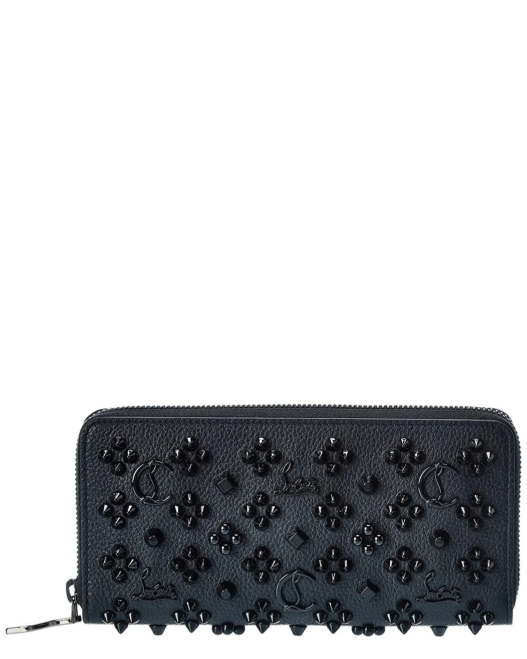 - About the brand: Christian Louboutin. Elegance, technical proficiency, and that signature red sole. - Panettone Studded Leather Zip Around Wallet in black leather with gunmetal-tone hardware - Interior design details: red leather and fabric lining, interior pockets, card slots, bill compartments - Measures 7.5in wide x 3.8in high x 1in deep - Zippered top - Please note: All measurements were taken by hand and are approximate; slight variations may occur. - Our products are 100% genuine. In some cases we purchase merchandise from trusted independent suppliers and not directly from the brand owner. In all cases we stand by the authenticity of every product sold on our site.