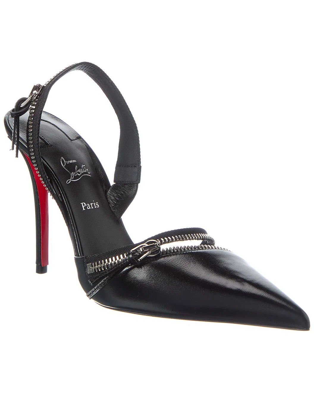 - About the brand: Christian Louboutin. Elegance, technical proficiency, and that signature red sole. - Please note: Size selections are European. For US conversions, please reference size chart. - Based on feedback from Members, this brand typically runs small and narrow. We suggest sizing up a half to full size for most styles. Sizing up won't increase the width of the toe box, however. - Made in Italy - Slingyzip 100 Leather Slingback Pump in black leather and silver-tone hardware with zipper trim - Lightly padded leather insole - Smooth leather sole - 4in heel - Please note: All measurements are approximate and were taken from a size 37; slight variations may occur. - Our products are 100% genuine. In some cases we purchase merchandise from trusted independent suppliers and not directly from the brand owner. In all cases we stand by the authenticity of every product sold on our site.