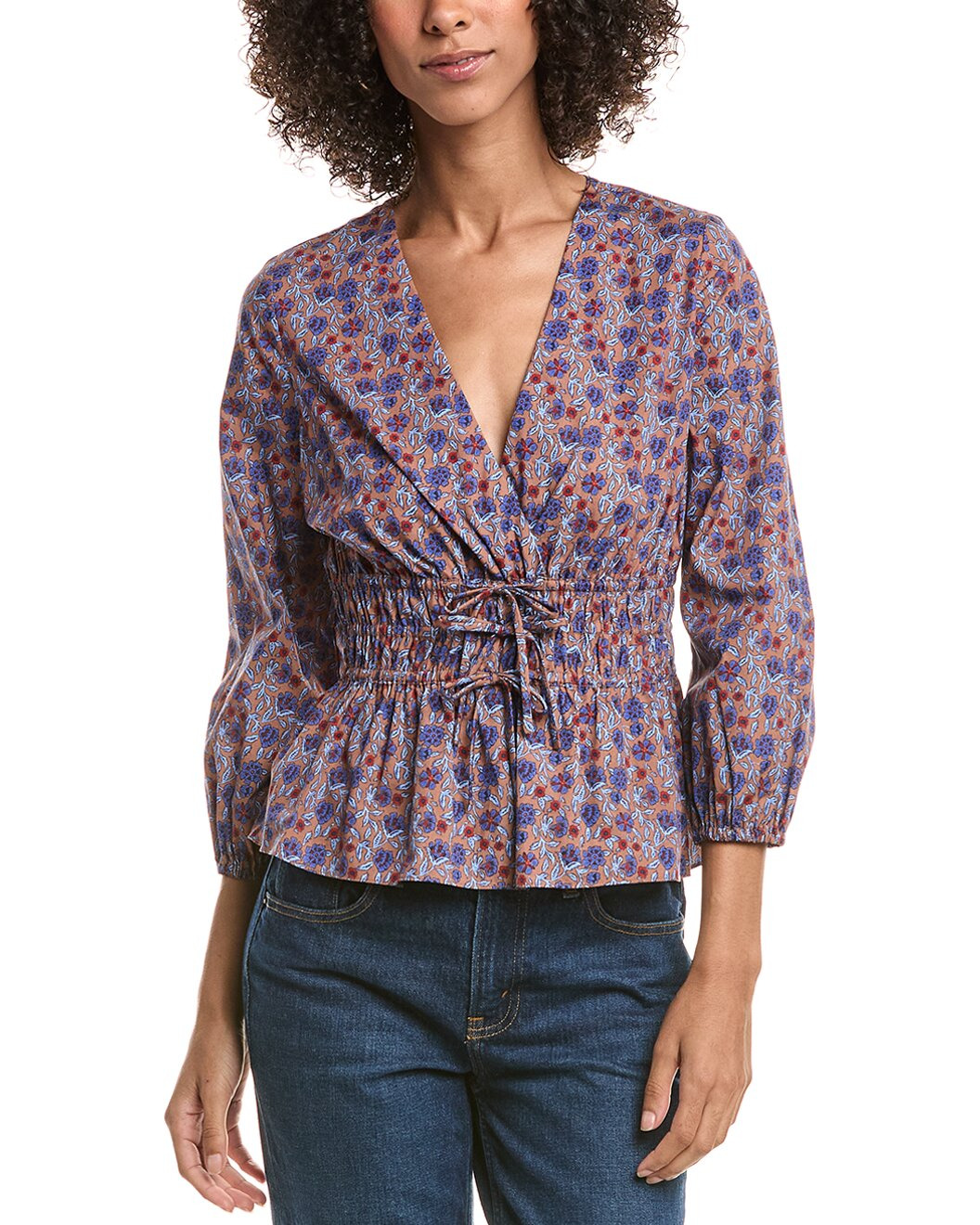 - About the brand: A relaxed, sensible approach to style with a touch of intelligence and unique charm. - Lilith V-Neck Blouse in dark mocha multicolor floral with balloon sleeves, triple elasticized waist, bow accents, and flounce hem - Approximately 20in from shoulder to hem - This item tends to run small (based on Member feedback). We recommend sizing up for your best fit. Model is 5'10 and is wearing a size 4. Measurements may vary slightly by size. - Shell: 100% viscose - Lining: 100% polyester - Dry clean only - Imported