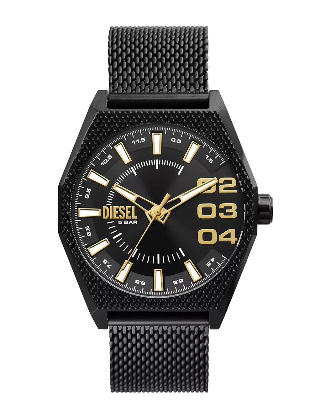 - Quartz movement - Black Stainless steel bracelet - Foldover clasp - Stainless Steel bezel - Stainless Steel case - Mineral crystal - Push/pull crown - Black dial - Case: 44mm x 10mm - Bracelet/strap: 22mm wide x 7.5in long - Water-resistant up to 50 meters - 1-year limited third party warranty - The Watch Size Guide