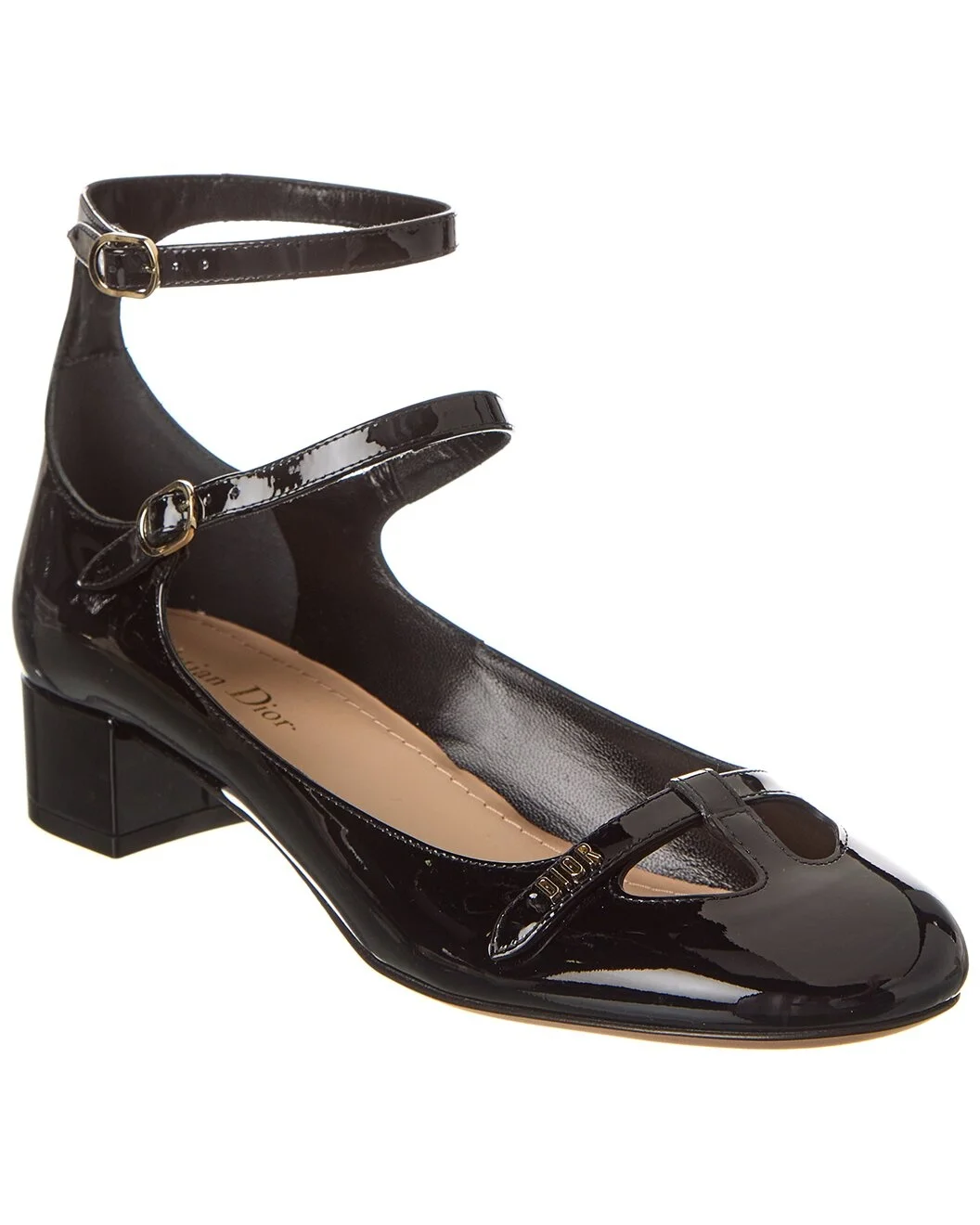 - About the brand: Elegant and timeless French luxury. - Please note: Size selections are European. For US conversions, please reference size chart. - Made in Italy - Aime Dior Patent Pump in black patent leather and gold-tone hardware with metal lettering logo - Adjustable ankle strap with buckle closure - Lightly padded leather insole - Smooth leather sole - 1.5in heel - Please note: All measurements are approximate and were taken from a size 37; slight variations may occur. - Our products are 100% genuine. In some cases we purchase merchandise from trusted independent suppliers and not directly from the brand owner. In all cases we stand by the authenticity of every product sold on our site.