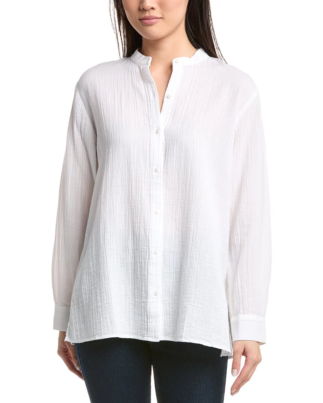 - About the brand: Versatile minimalist shapes, ethically made. - Mandarin Collar Shirt in white with gauze design and slits at hem - Approximately 29in from shoulder to hem - This item tends to run large (based on Member feedback). We recommend sizing down for your best fit. Model is 5'10 and is wearing a size S. Measurements may vary slightly by size. - Button front - 100% organic cotton - Machine wash - Imported
