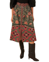 Farm Rio Arabesque Floral Green Buttons Midi Skirt