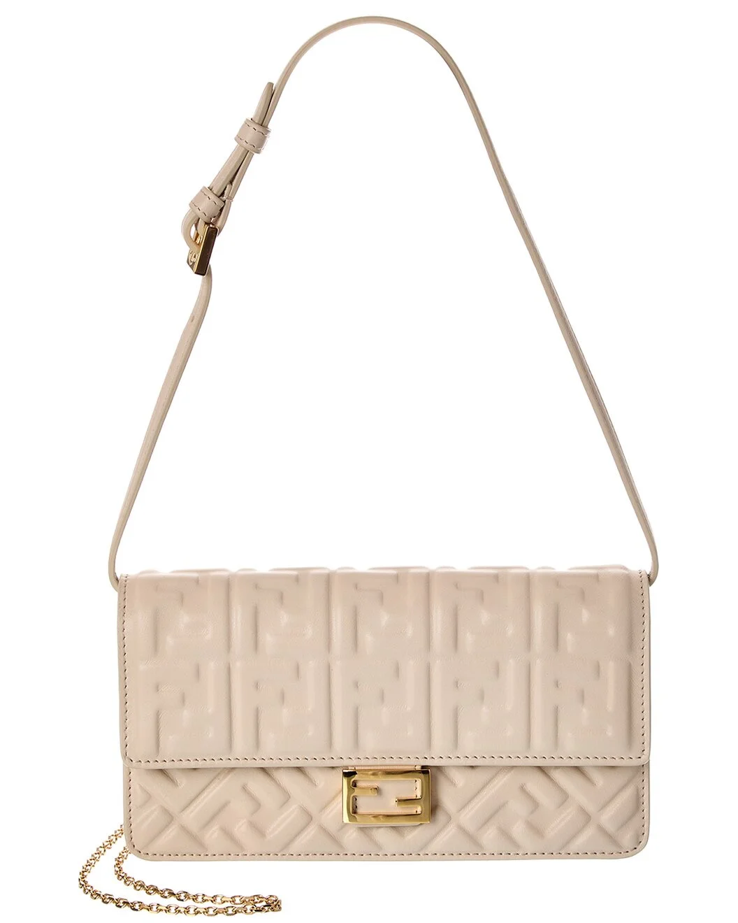 - About the brand: Innovative and elegant Italian luxury. - Made in Italy - Baguette FF Leather Wallet On Chain in brown FF leather with gold-tone hardware and interchangeable shoulder straps - Interior design details: leather lining, interior pocket, card slots - Measures 8in wide x 4.75in high x 1.5in deep - Removable shoulder strap drops 23in - Adjustable and removable shoulder strap drops 18in - Fold-over flap with magnetic closure - Please note: All measurements were taken by hand and are approximate; slight variations may occur. - Our products are 100% genuine. In some cases we purchase merchandise from trusted independent suppliers and not directly from the brand owner. In all cases we stand by the authenticity of every product sold on our site.