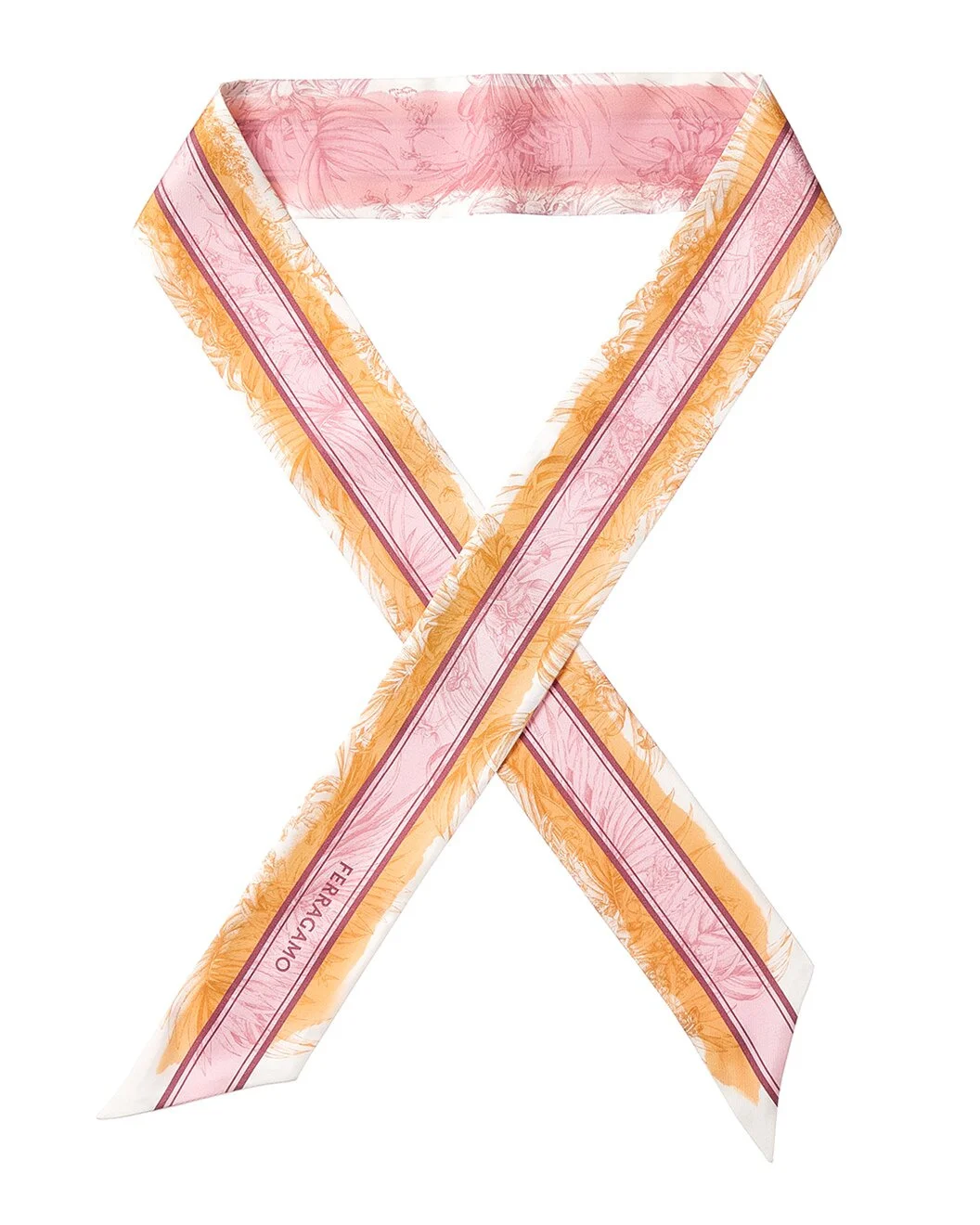 - About the brand: The Gancini, The Vara, and all the icons in-between. - Gravure Silk Scarf in pink multicolor - Measures 55in long x 2.75in wide - 100% silk - Dry clean only - Made in Italy - Please note: All measurements were taken by hand and are approximate; slight variations may occur. - Our products are 100% genuine. In some cases we purchase merchandise from trusted independent suppliers and not directly from the brand owner. In all cases we stand by the authenticity of every product sold on our site.