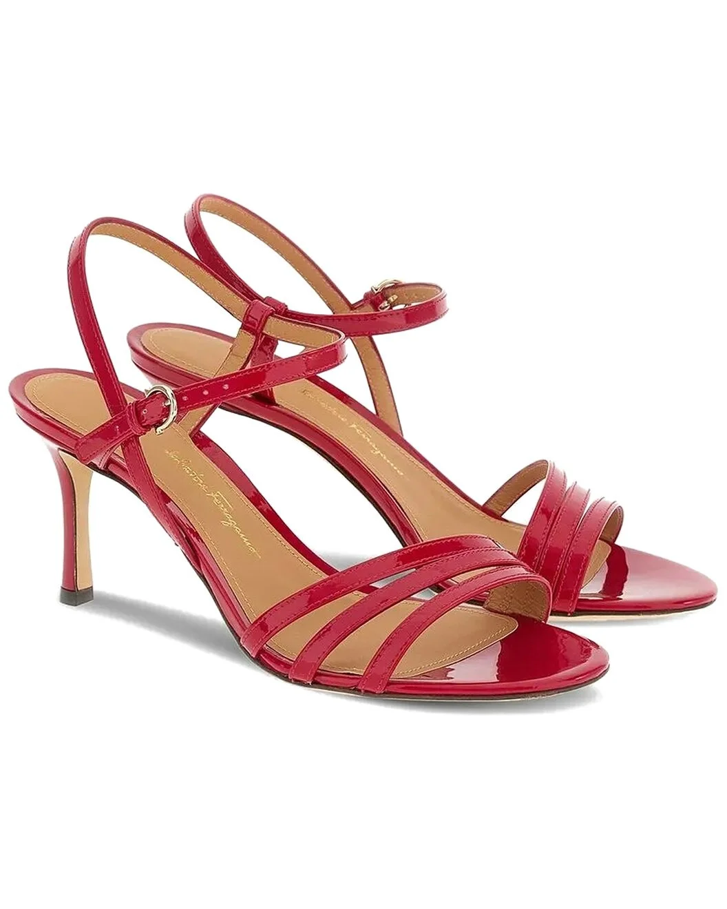 - About the brand: The Gancini, The Vara, and all the icons in-between. - Made in Italy - High-Shine 7mm Leather Sandal in red leather - Buckle closure - Leather sole - 3in heel - Our products are 100% genuine. In some cases we purchase merchandise from trusted independent suppliers and not directly from the brand owner. In all cases we stand by the authenticity of every product sold on our site.