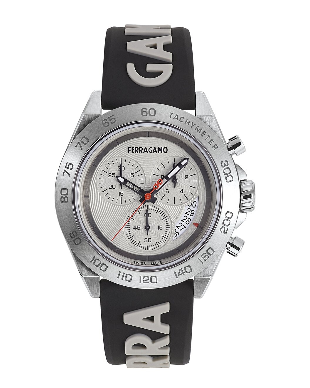 - About the brand: The Gancini, The Vara, and all the icons in-between. - Chronograph Date Quartz chronograph movement - Black Silicone strap - Deployant clasp - Stainless Steel bezel - Stainless Steel case - Sapphire crystal - Push-pull crown - Grey dial - Date display - Case: 43mm x 11.9mm - Bracelet/strap: 22mm wide x 82 x 120mm long - Water-resistant up to 50 meters - Manufacturer's limited warranty - Swiss Made - The Watch Size Guide - Our products are 100% genuine. In some cases we purchase merchandise from trusted independent suppliers and not directly from the brand owner. In all cases we stand by the authenticity of every product sold on our site.