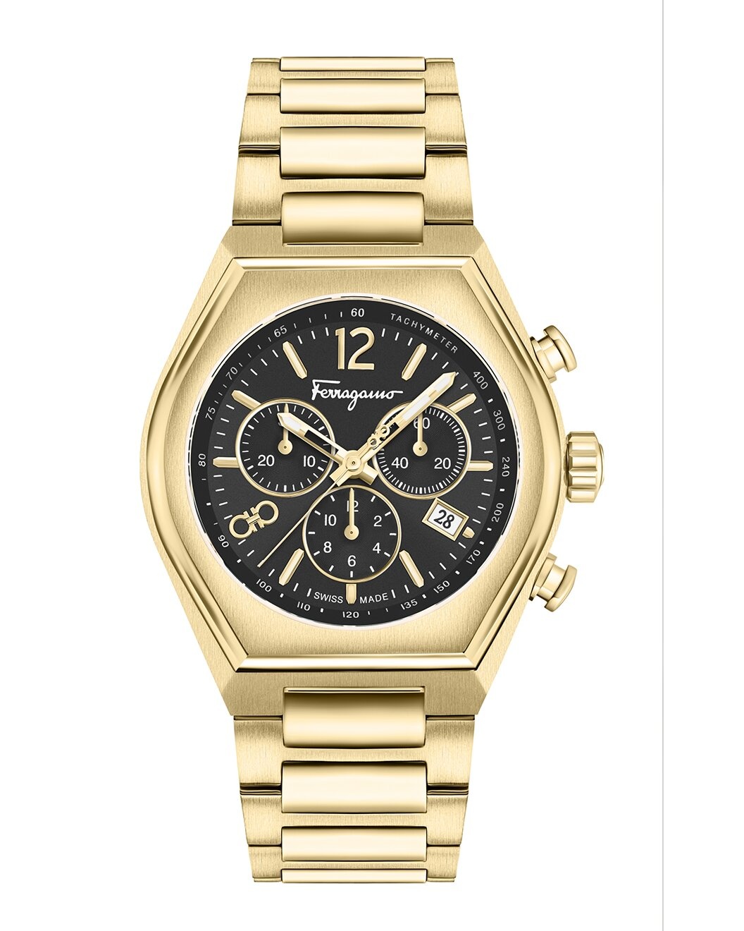 - About the brand: The Gancini, The Vara, and all the icons in-between. - Chronograph Date Quartz chronograph movement - Gold Stainless Steel bracelet - Deployant clasp - Stainless Steel bezel - Stainless Steel case - Sapphire crystal - Push-pull crown - Black dial - Date display - Case: 42mm x 10.05mm - Bracelet/strap: 14mm wide x 163.92mm long - Water-resistant up to 50 meters - Manufacturer's limited warranty - Swiss Made - The Watch Size Guide - Our products are 100% genuine. In some cases we purchase merchandise from trusted independent suppliers and not directly from the brand owner. In all cases we stand by the authenticity of every product sold on our site.