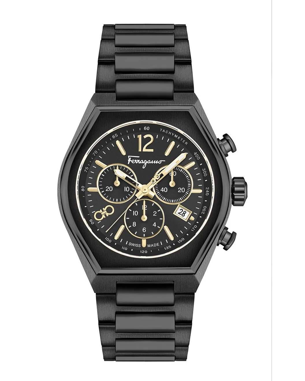 - Guaranteed for Christmas. Delivery restrictions apply. - See disclaimer. - About the brand: The Gancini, The Vara, and all the icons in-between. - Chronograph Date Quartz chronograph movement - Black Stainless Steel bracelet - Deployant clasp - Stainless Steel bezel - Stainless Steel case - Sapphire crystal - Push-pull crown - Black dial - Date display - Case: 42mm x 10.05mm - Bracelet/strap: 14mm wide x 163.92mm long - Water-resistant up to 50 meters - Manufacturer's limited warranty - Swiss Made - The Watch Size Guide - Our products are 100% genuine. In some cases we purchase merchandise from trusted independent suppliers and not directly from the brand owner. In all cases we stand by the authenticity of every product sold on our site.