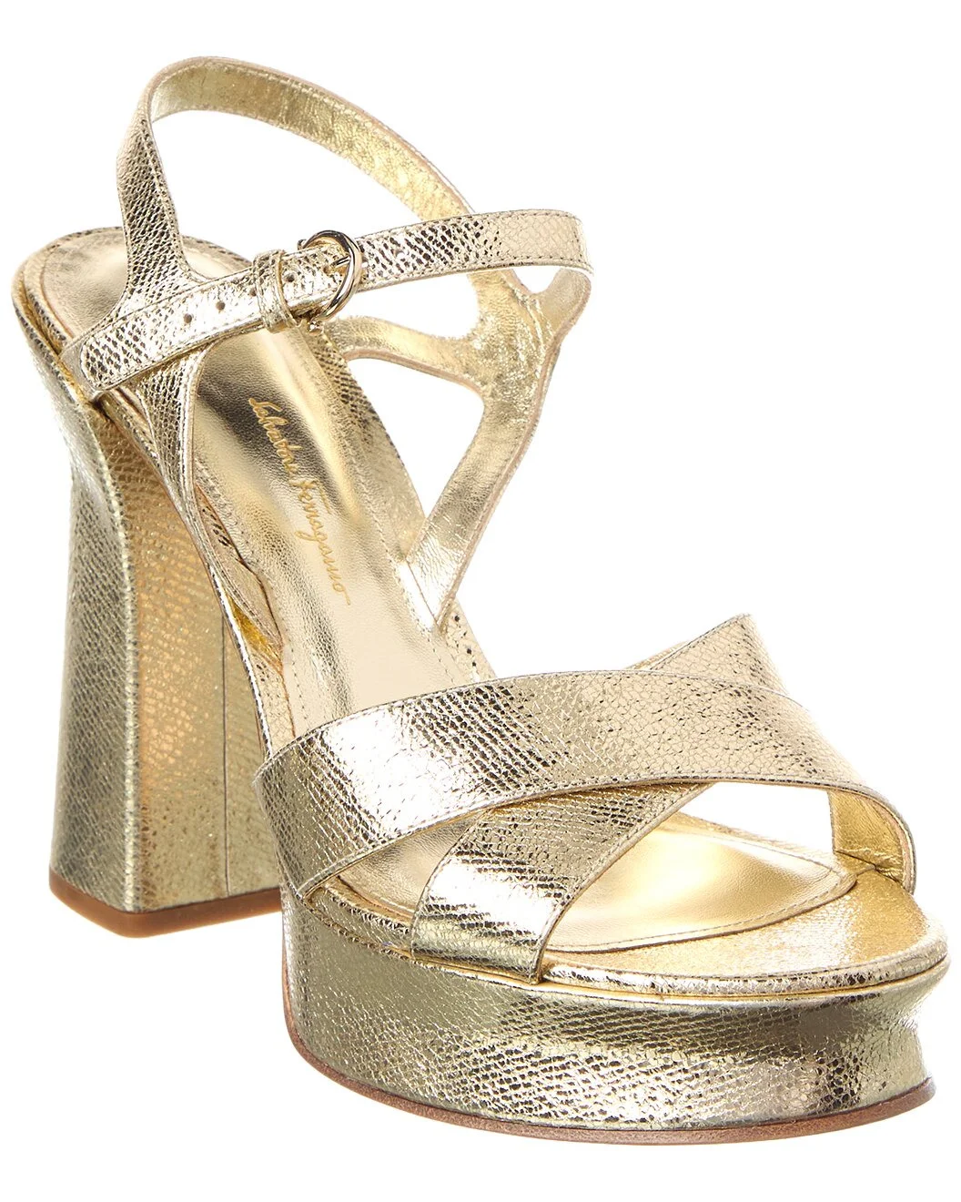 - About the brand: The Gancini, The Vara, and all the icons in-between. - Please note: B indicates narrow sizing; C indicates standard sizing; D indicates wide sizing; M indicates medium sizing. - Made in Italy - Sonya Leather Platform Sandal in gold leather and gold-tone hardware with Gancini buckle - Adjustable ankle strap with buckle closure - Lightly padded leather insole - Smooth leather sole - 5.5in heel - 1.5in platform - Please note: All measurements are approximate and were taken from a size 10; slight variations may occur. - Our products are 100% genuine. In some cases we purchase merchandise from trusted independent suppliers and not directly from the brand owner. In all cases we stand by the authenticity of every product sold on our site.