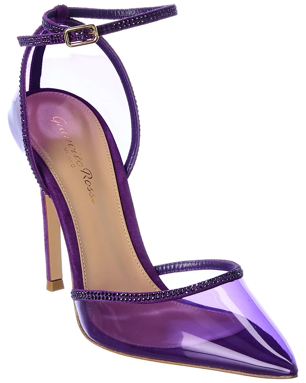 - About the brand: Effortless and wearable Italian chic. - Please note: Size selections are European. For US conversions, please reference size chart. - Made in Italy - 105 Suede-Trim Pump in violet orchid suede and pvc and gold-tone hardware with rhinestone embellishments - Adjustable ankle strap with buckle closure - Lightly padded leather insole - Smooth leather sole - 4.1in heel - Please note: All measurements are approximate and were taken from a size 37; slight variations may occur. - Our products are 100% genuine. In some cases we purchase merchandise from trusted independent suppliers and not directly from the brand owner. In all cases we stand by the authenticity of every product sold on our site. - WARNING: - CA Residents - Prop 65