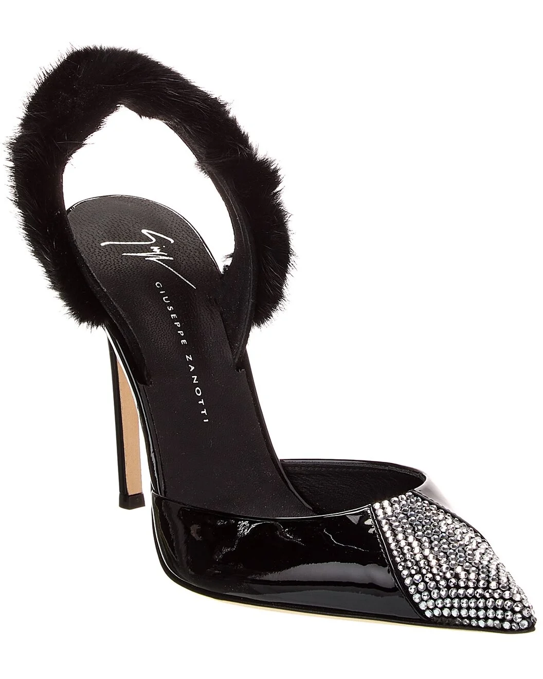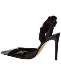 - About the brand: Glamourous & creative footwear and accessories with edge. - Please note: Size selections are European. For US conversions, please reference size chart. - Based on feedback from Members, this brand typically runs small. We suggest sizing up a half size for most styles. - Made in Italy - Braquel 105 Patent Slingback Pump in black patent leather with rhinestone-embellished toe and faux fur slingback strap - Lightly padded leather insole - Smooth leather sole - 4.5in heel - Please note: All measurements are approximate and were taken from a size 37; slight variations may occur.