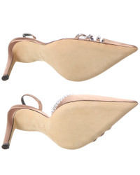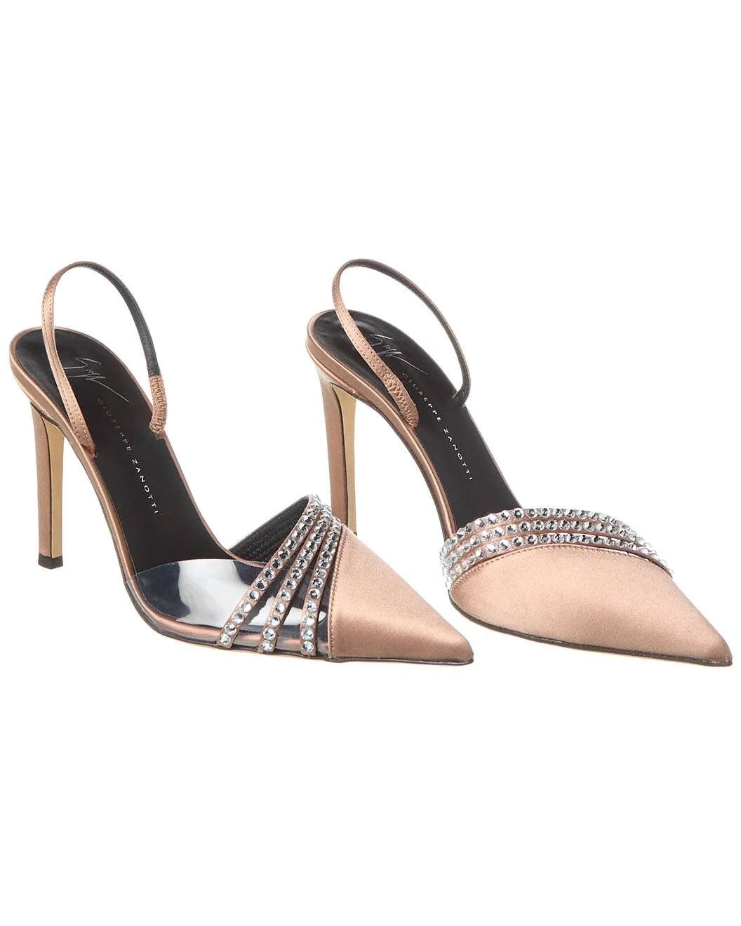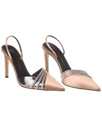 - About the brand: Glamourous & creative footwear and accessories with edge. - This is an authentic, pre-loved piece. This item may show signs of wear. - For more information on condition, please see our condition guide at the bottom - Please note: Size selections are European. For US conversions, please reference size chart. - Based on feedback from Members, this brand typically runs small. We suggest sizing up a half size for most styles. - Made in Italy - Braquel 105 Satin & Vinyl Slingback Pump in antique satin and transparent vinyl and silver-tone hardware with crystal embellishments - Lightly padded leather insole - Smooth leather sole - 4in heel - Please note: All measurements are approximate and were taken from a size 37; slight variations may occur. - WARNING: - CA Residents - Prop 65 - The Pre-Loved Condition Guide